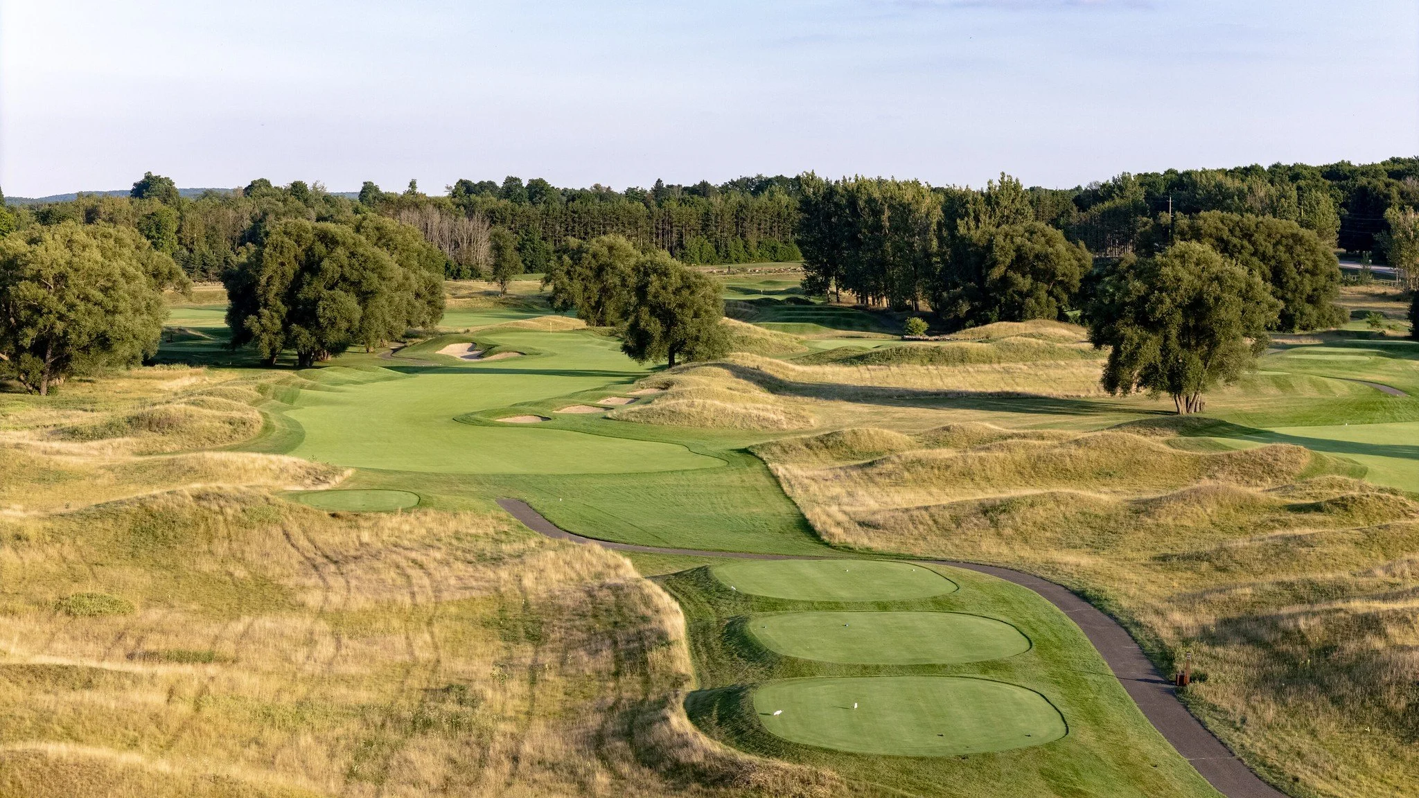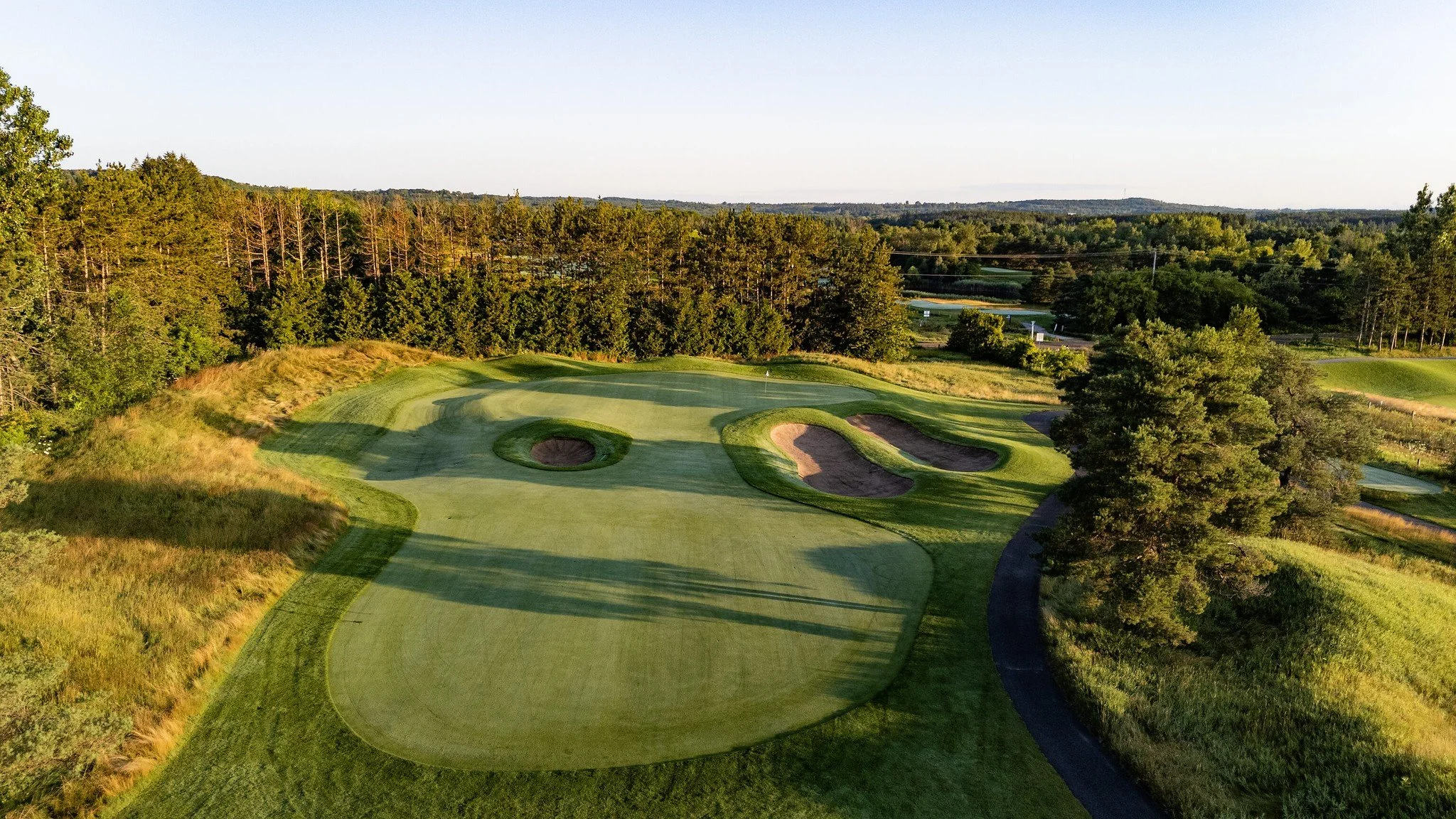 A short par-3 with a severe back-to-front tilt, the fourth is an exercise in precision and spin control, with severe contours making the large putting surface play effectively much smaller depending on the hole location. While most players will hit a short iron or even wedge, the contours of the green and steep runoff area to the right will funnel any shot that leaks to the right or lands with too much spin down a steep runoff area and create a very difficult second shot. The fourth plays shortest of the North9s four par-3s, sandwiching scoring opportunities (along with the short par-4 sixth) around the brawny par-4 fifth.