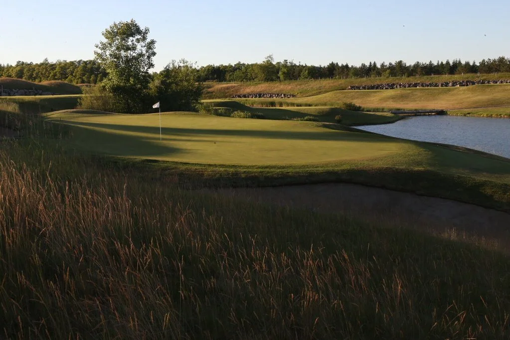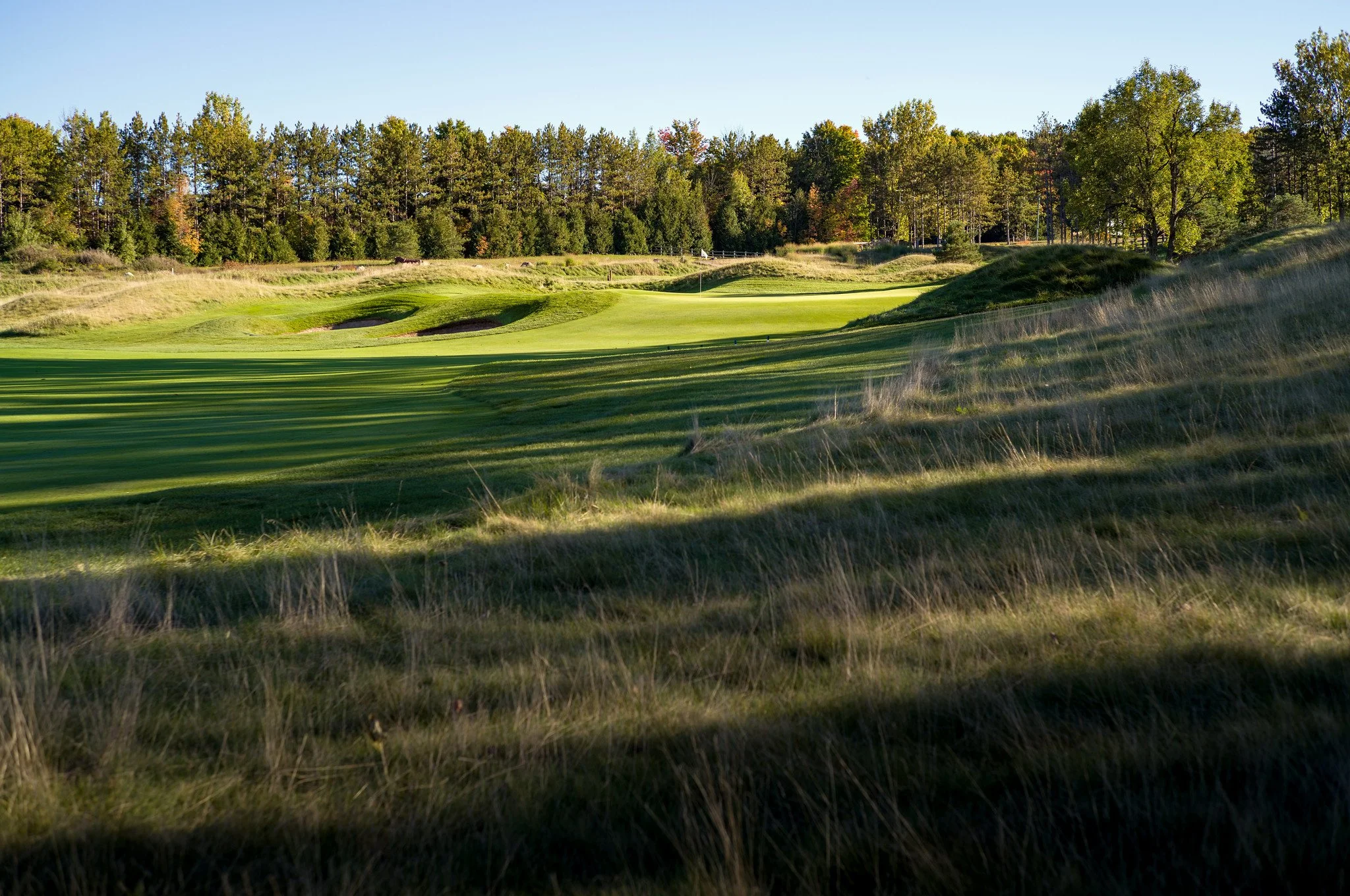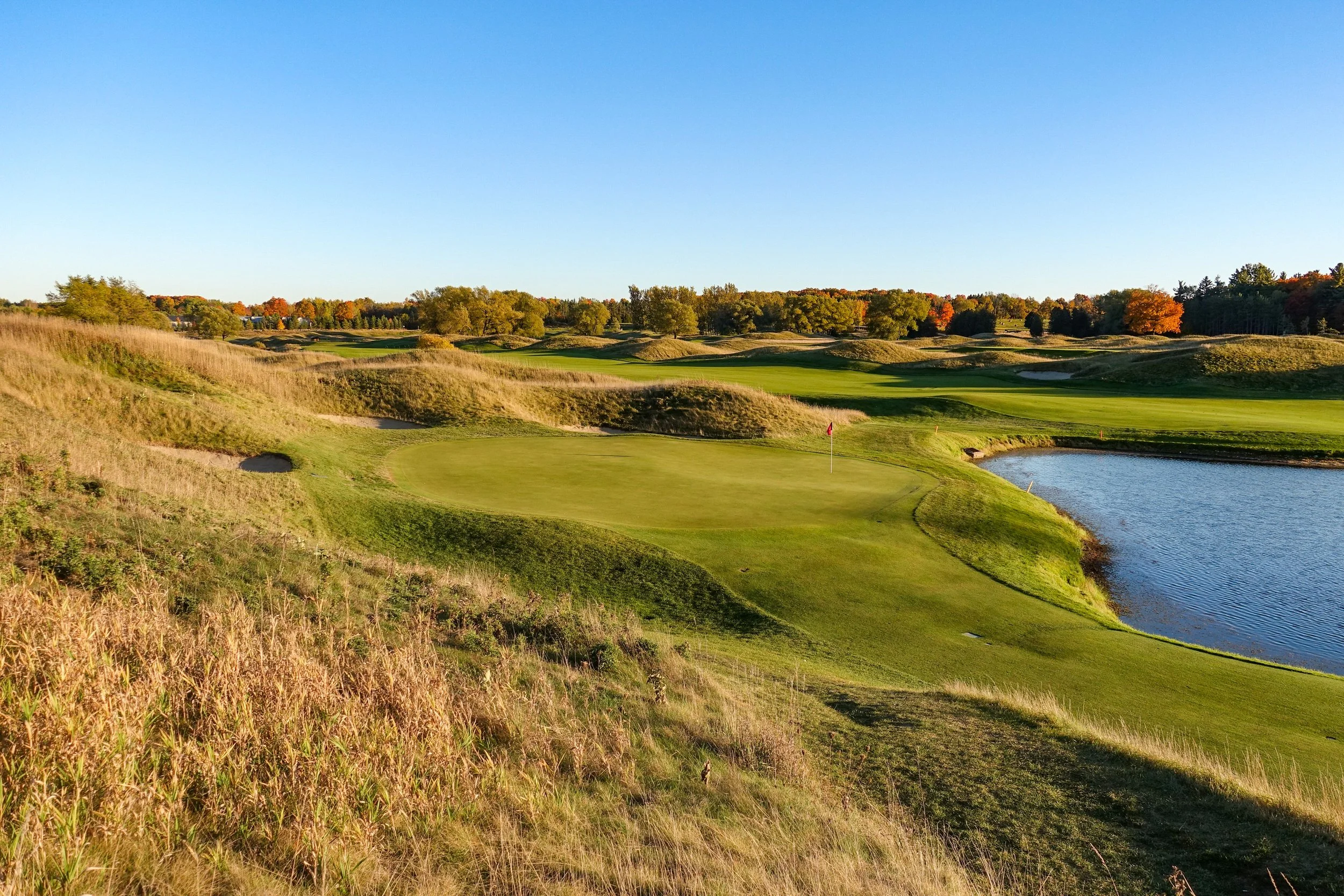 A long par-3, the 11th represents one of the most dramatic changes from the 2023 renovation of the North course. The green sits between a pond and a massive slope on the left side, requiring players to either hit a courageous shot over water or play out left and suffer the consequences. A small shortgrass area sits short and left of the green as a bailout option for more timid tee shots, while the fescue-covered hillside punishes approaches that sail long left. The green features a distinct spine in the middle separating the putting surface into two main sections.