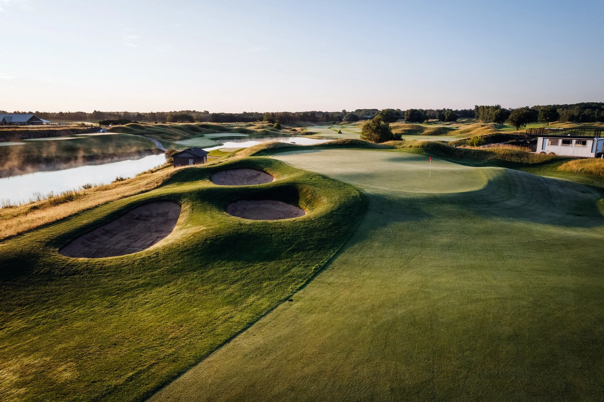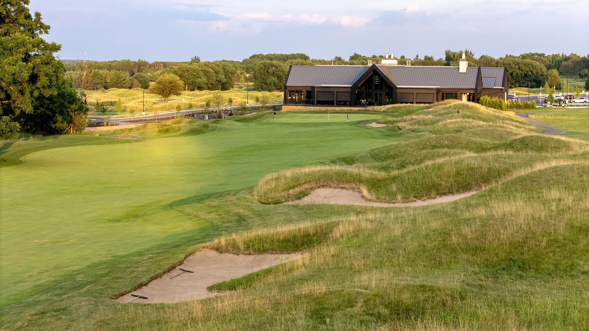 A long par-3 framed by two large back bunkers, a short-left bunker and a lurking pond short and left. With a large opening to the green from the right side and an ample bail out area, the hole offers players the chance to safely play short and right or take on the challenge of hitting the green from a long distance. A spine through the left side of the green protects left side hole locations, with a back-to-front slope presenting an alternate option for players to funnel the ball to the back-left of the green.