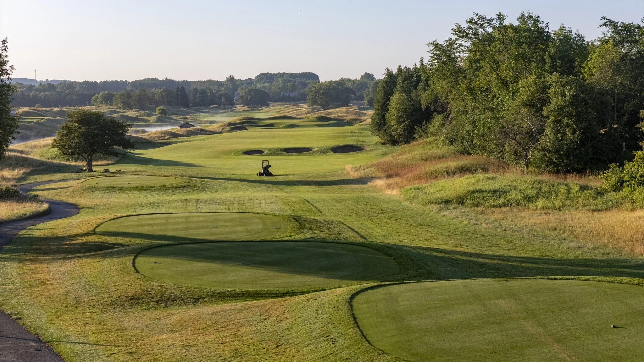 The first tee asks players to determine how aggressive they'd like to be with their first shot of the round. The fairway slopes hard from left-to-right, requiring players to take a dangerous line down the left hand side to find the optimal landing zone on both the tee shot and lay-up, while conservative plays down the right side are made complicated by the presence of two imposing bunkers that flank the right side of the hole.