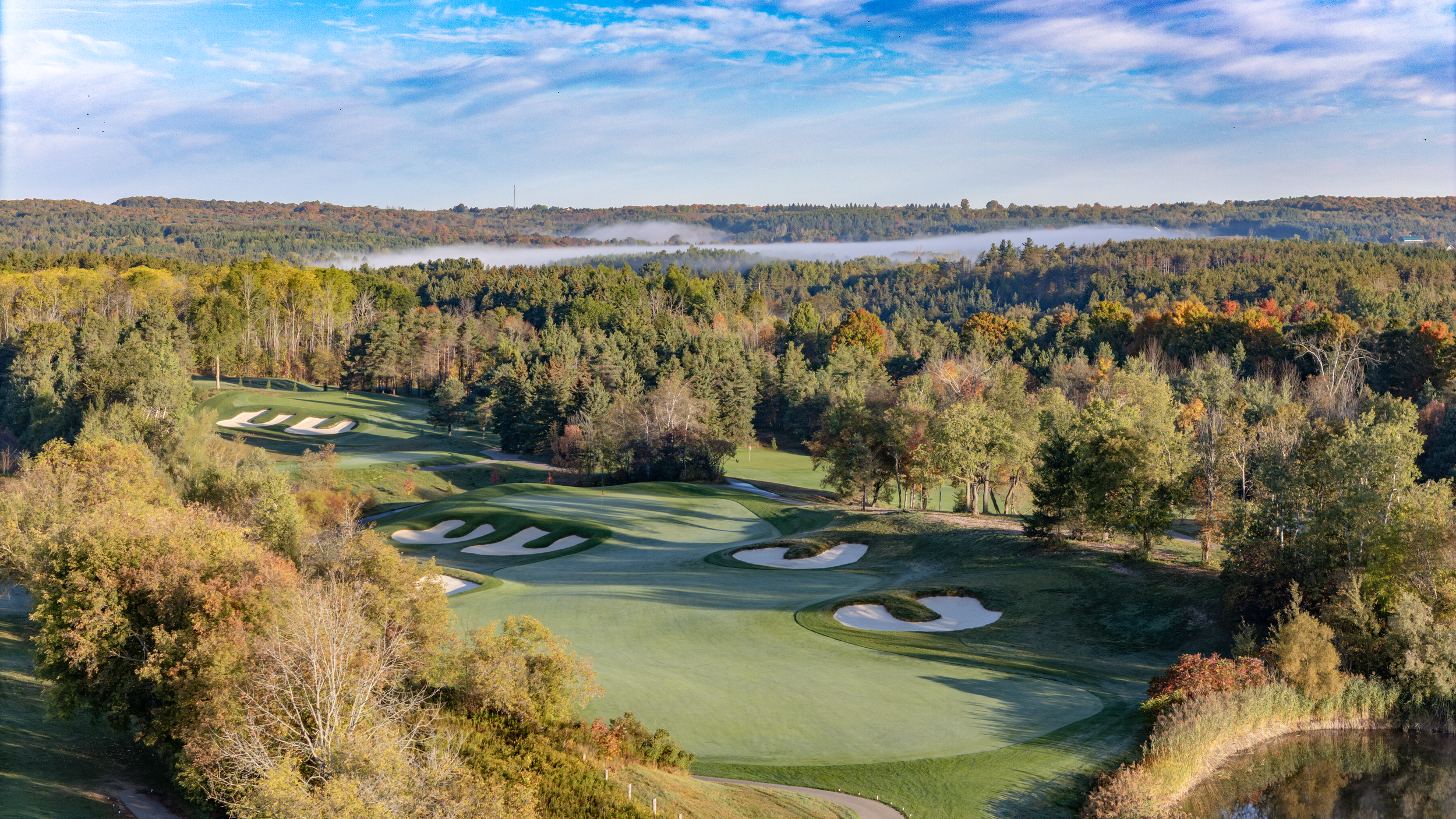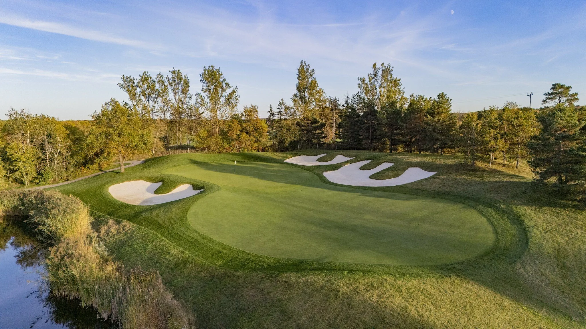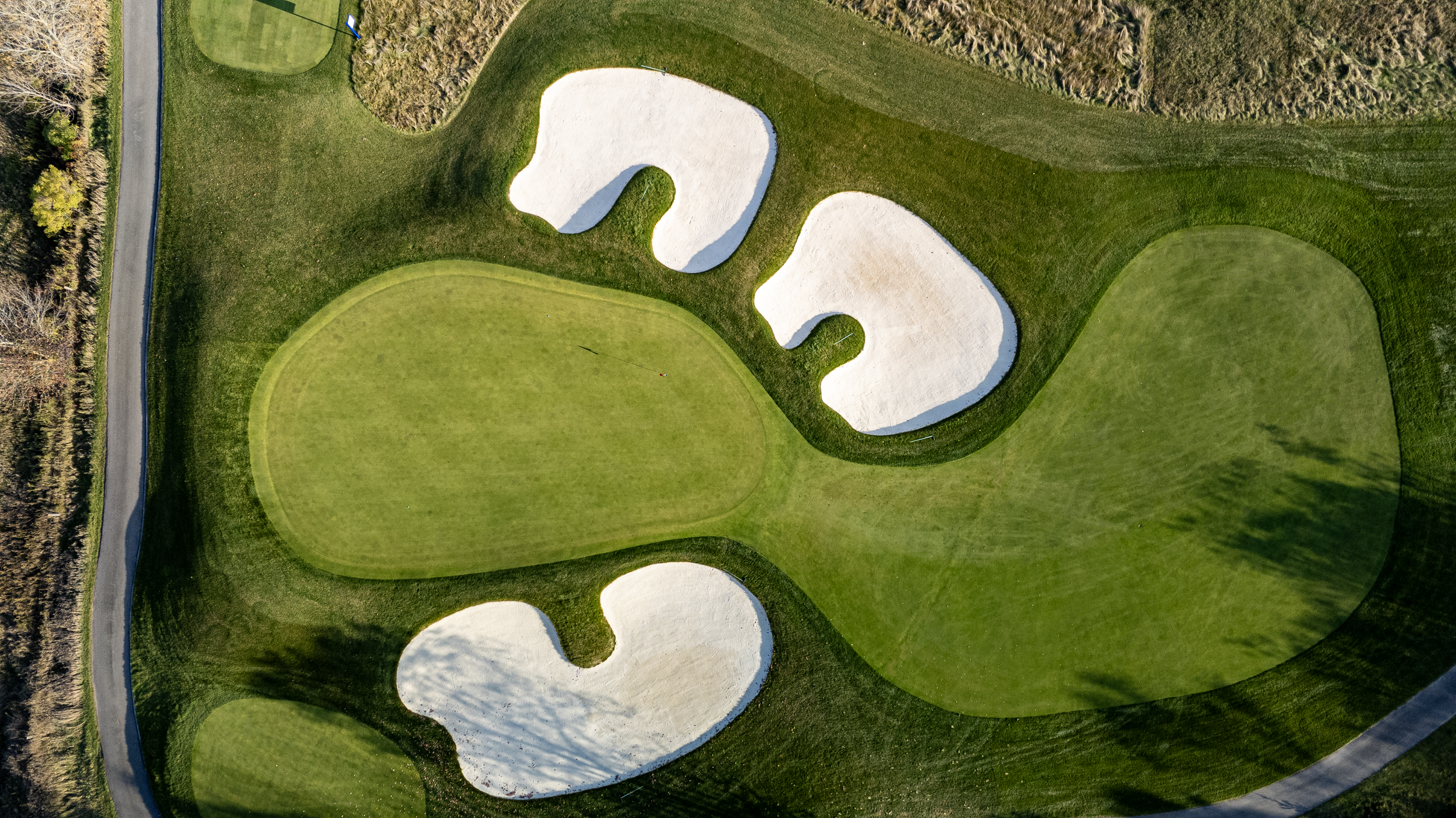 A long par-3 framed by two large back bunkers, a short-left bunker and a lurking pond short and left. With a large opening to the green from the right side and an ample bail out area, the hole offers players the chance to safely play short and right or take on the challenge of hitting the green from a long distance. A spine through the left side of the green protects left side hole locations, with a back-to-front slope presenting an alternate option for players to funnel the ball to the back-left of the green.